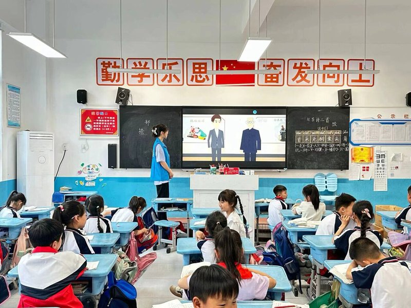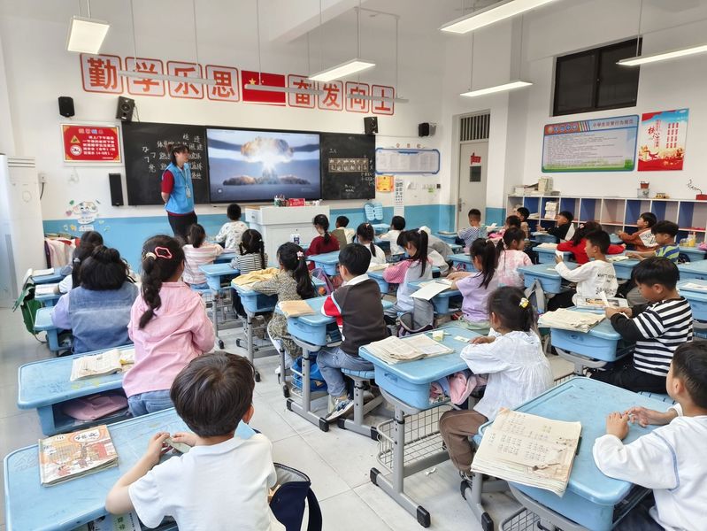 活动第一站,宣讲团来到花山小学开展 “两弹一星”精神宣讲。志愿者们通过书籍、图片、视频等形式向小学生们介绍了“两弹一星”的发展沿革、研制工程、功勋人物、工程意义,讲述了研发过程中的艰辛历程,激发同学们的爱国热情和民族自豪感,让他们深刻认识到只有通过艰苦奋斗和自主创新,才能实现国家的繁荣富强。