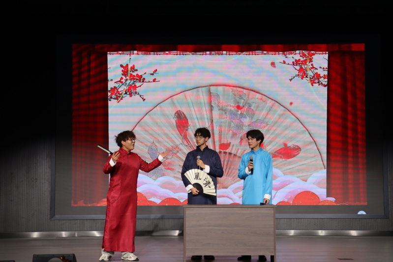 小品《非诚勿扰》表演中,同学们“戏精附体”,讨论爱情的真谛,表演的淋漓尽致,欢笑声洒满校园。