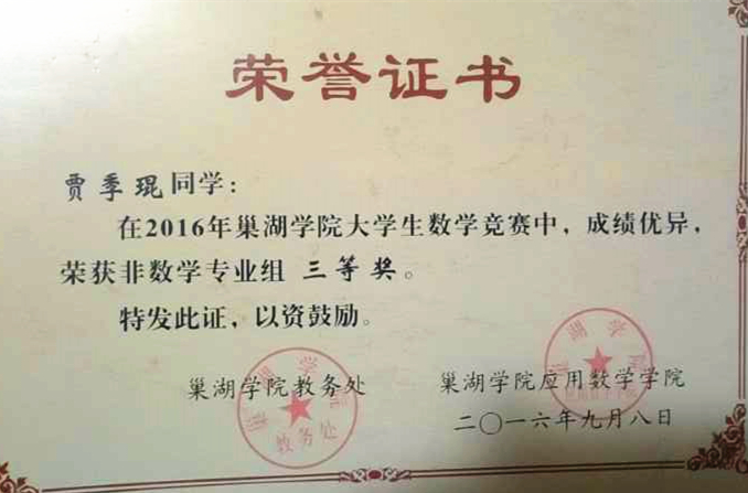 毕竟时间太瘦,指缝太宽,在谈及过往经历时,记忆总会有点模糊,但唯独一件事她仍记忆犹新并深深的烙在了她的心里。那是在参加数学建模大赛期间,贾季琨与两名同学共同组队参加这项比赛,比赛要求在三天的时间之内围绕已给题目写出一篇论文,这是一场创新能力的比拼,也是一场与时间的赛跑,更是团队合作意识的体现。在这三天的时间里,他们除了吃饭睡觉,几乎所有的时间都在博学楼实验室里。因为涉及到专业知识,而其中一名队友并非本专业,因此相关方面的知识比较薄弱,在合作过程中产生了一系列问题,他们并没有放弃,虽然准备了三天已经很累了,但他们最后一天晚上仍通宵赶出了比赛论文。过程虽苦,但却值得,虽然最后只获得了校级二等奖,但是他们在累到极致、几度崩溃的边缘仍然完成了比赛就已经成功了。