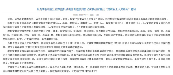 将党建工作融入教学工作,培育教学科研匠心。支部坚持以机械设计制造及其自动化教研室为依托,秉承“围绕教学抓党建,抓好党建促发展”的工作理念,党员事事冲锋在前,扎实做好课程研究、教学方法研究和应用科学研究等工作。近五年来,累计完成或在研各类教改项目16项,其中国家级1项,省级4项,校级11项;发表教研论文30篇;获批省级、校级教学成果奖6项;获批省部级科研项目8项,校级科研项目9项;发表科研论文37篇,其中:SCI检索5篇,EI检索6篇。1人荣获全省优秀教师称号,2人荣获省级教坛新秀称号。机械教研室在2015、2017、2019年度考核中,均以理科组第一的成绩被评定为优秀;2018年获批安徽省首批优秀基层教研室示范项目并顺利通过2019年省级专业评估;2020年6月,由于以党建促发展工作出色,机械教研室荣获安徽省工人先锋号称号。