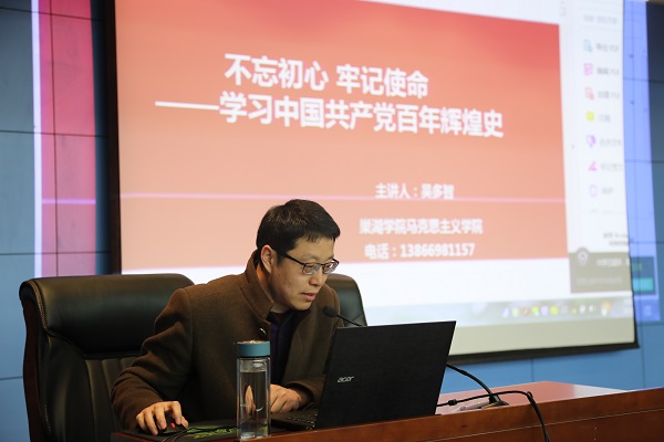 吴多智老师以初心使命为主线,从为什么学习党史、怎么学、学什么三个方面叙述了党的百年辉煌史,从建党伟业、革命建国、治国理政三个阶段梳理了党史脉络。