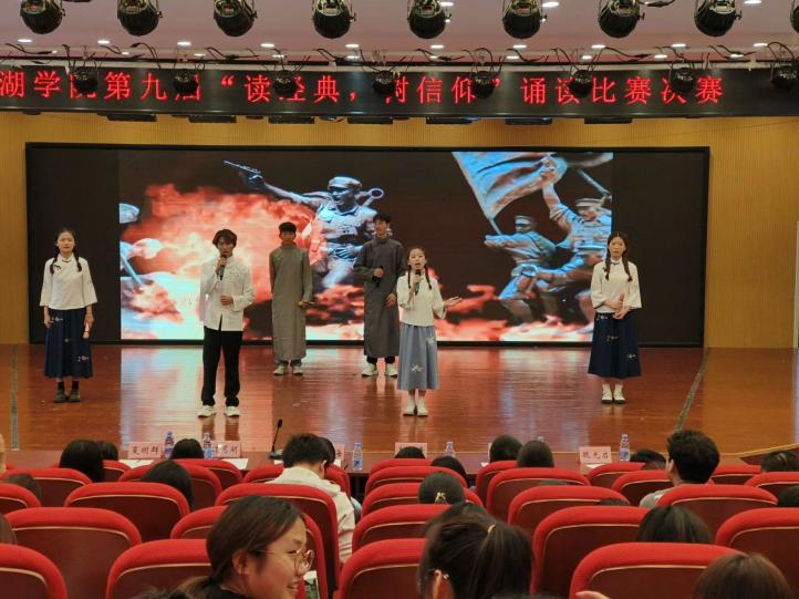 在全校上下深入学习贯彻习近平新时代中国特色社会主义思想和党的二十大精神之际,为了引导青年大学生进一步亲近经典、感悟经典,在经典中传承优秀传统文化和革命文化,汲取前进力量,6月9日下午,马克思主义学院在艺术楼报告厅举办第九届大学生“读经典 树信仰”诵读比赛决赛。此次比赛由金年汇官方入口党委宣传部、共青团金年汇官方入口委员会、金年汇官方入口马克思主义学院主办,金年汇官方入口知行学社、Vision微电影创意协会承办。经过前期面向2021级全体学生的初赛、复赛的认真选拔,共10组队伍参加了当天的决赛。石庆海、郭启贵、过慈明、夏明群、魏光启、贾绍俊等5位老师担任本次比赛评委,100多名师生现场观看了比赛。
