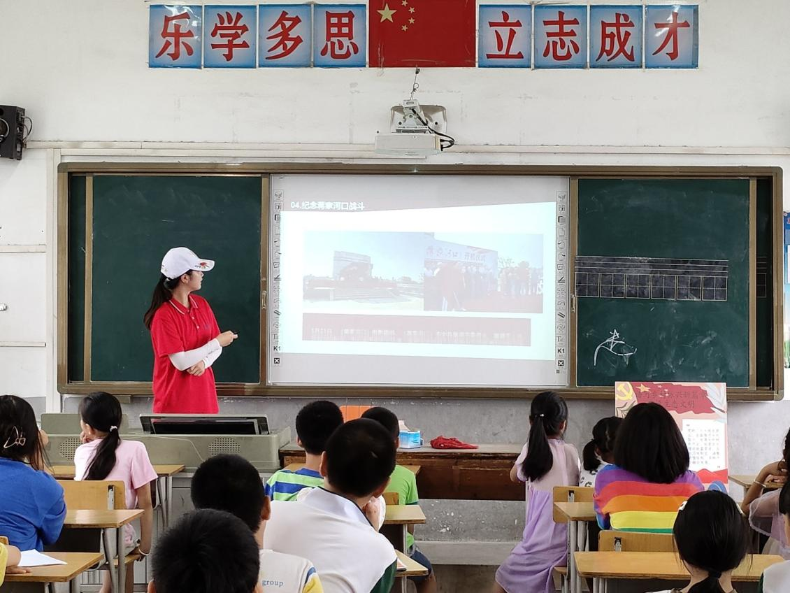 团队队长21级环境设计专业吴谢瑾同学以“蒋家河口伏击战——新四军抗日第一仗”为题,结合实践考察图片、视频、史料记载和人物调研等,生动形象又真实客观地向小学生们展现蒋家河口伏击战的背景、过程、路线及意义。吴谢瑾同学以如何纪念蒋家河口战斗结束宣讲,强调要深入认识党的精神谱系、传承党的红色基因、赓续党的红色血脉。