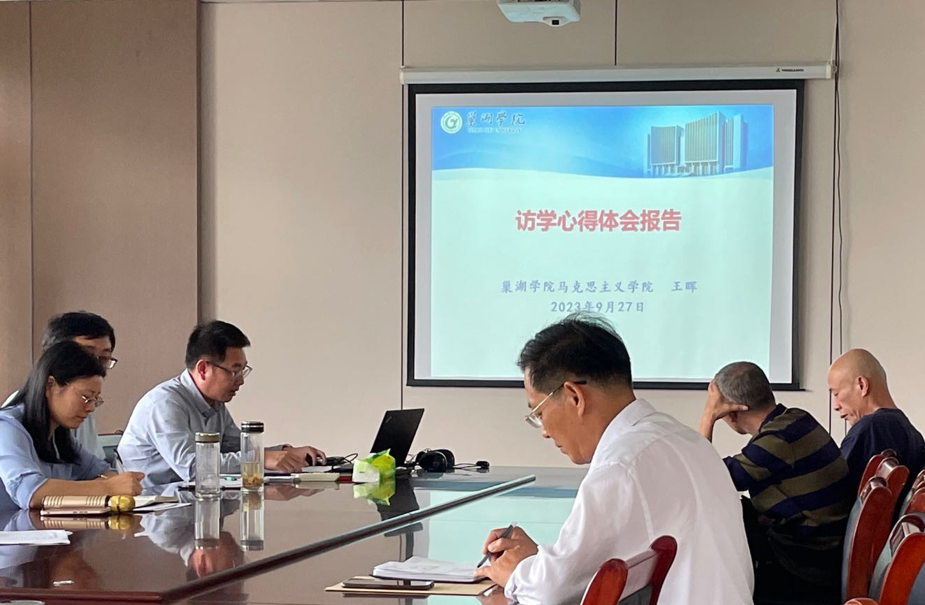 2023年9月27日下午,王晖老师在马克思主义学院会议室作访学心得体会报告,会议由马克思主义学院副院长杨芳主持,马克思主义学院全体教职工参加会议。