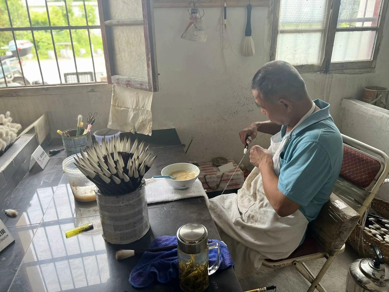 最后,实践团队采访了宣笔传承人伍森严先生。伍先生不仅技艺高超,还积极推广宣笔文化,获得广泛认可。访谈中,团队了解到宣笔制作的复杂工序和传承挑战。伍先生强调,宣笔制作需严格遵循传统,宣笔的独特优势在于其精湛工艺、精选材料和深厚的历史文化底蕴,其笔头选用特定毛兔双箭毛,赋予书写非凡弹性和表现力。伍先生认为,宣笔制作需在坚守传统的同时创新,以适应新时代的需求,优质宣笔能显著提升宣扇的艺术价值和市场竞争力。