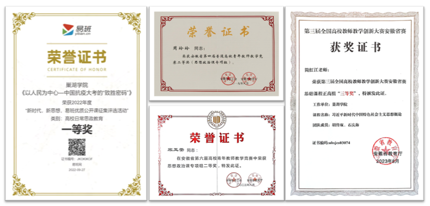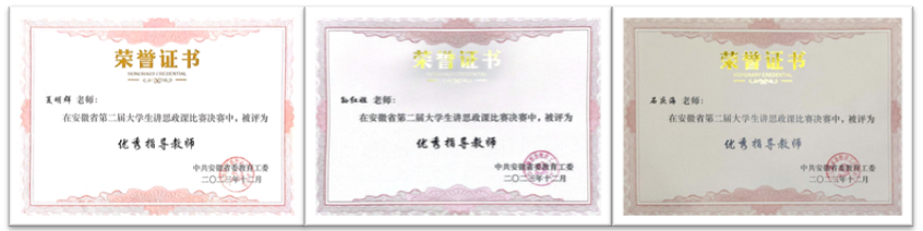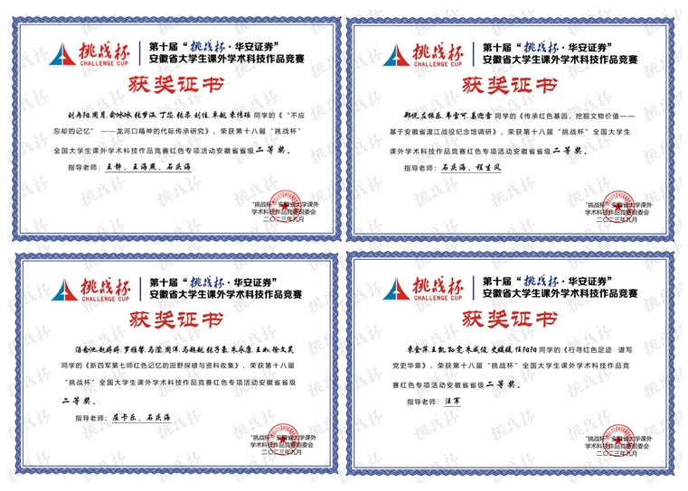 近年来,马克思主义学院积极联动校党委宣传部、学工部、团委,指导建立明德学社、知行学社、红色文化研习社、汤山讲“习”社等大学生理论社团,积极组织教师指导学生开展暑期“三下乡”社会实践、“挑战杯”红色专项、大学生创新创业、大学生讲思政课等活动与赛事,先后荣获第十届“挑战杯”安徽省大学生课外学术科技作品竞赛(红色专项)省级二等奖 4 项、三等奖 1 项、安徽省 2023 年大学生暑期“三下乡”社会实践活动优秀调研报告评比省级二等奖 1 项、安徽省第二届大学生讲思政课公开课展示活动皖中片区赛二等奖 2 项、三等奖 1 项,安徽省决赛二等奖2 项。以参加各类比赛为契机,马克思主义学院不断推动思想政治理论课改革创新,激发学生学习积极性,增强思想政治理论课的思想性、理论性、亲和力与针对性。