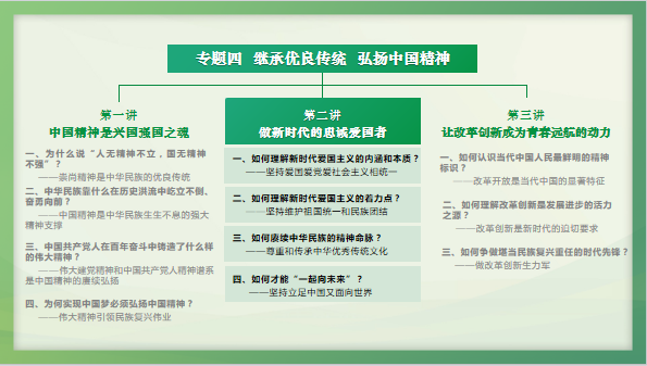 备课会上,两位老师结合审核评估的教学要求和统一课件特点,围绕“专题四 继承优良传统 弘扬中国精神”展开了教学分享。王静老师首先分享了专题四第二讲“做新时代的忠诚爱国者”的教学内容。她逐一讲述了本讲的教学设计、逻辑结构、重难点内容、教学案例。接着,王晖老师分享了专题四第三讲“让改革创新成为青春远航的动力”,他对该讲的内容进行了适度的扩展,融入了党的创新理论的最新成果,做了教学设计的优化。