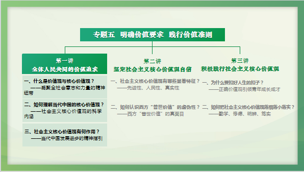 备课会上,两位老师结合审核评估的教学要求和统一课件特点,围绕“专题五 明确价值要求 践行价值准则”展开了教学分享。过慈明老师首先分享了专题五第一讲“全体人民共同的价值追求”的教学内容。她逐一讲述了本讲的教学设计、逻辑结构、重难点内容、教学案例,强调要厘清价值观与核心价值观的内涵,认清核心价值观的作用。接着,开琛老师分享了专题五第二讲“坚定社会主义核心价值观自信”,她对该讲的内容理论性和思想性进行了详细解读,有效融入了党的创新理论的最新成果,深入阐释了社会主义核心价值观的先进性、人民性和真实性。