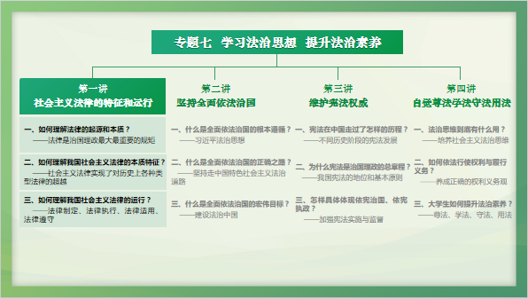 备课会上,两位老师结合审核评估的教学要求和统一课件特点,围绕“专题七 学习法治思想 提升法治素养 ”展开了教学分享。张丽丽老师首先分享了专题七第一讲“社会主义法律的特征和运行”的教学内容。她逐一讲述了本讲的教学设计、逻辑结构、重难点内容以及教学案例,强调要讲清法律的内涵和社会主义法律的本质特征,把握社会主义法律的运行。接着,开琛老师就本讲内容也进行了同课异构的教学分享,她强调要有效融入了党的二十届三中全会精神的最新理论成果,深入解读社会主义法律是如何实现对历史上各种类型法律的超越。