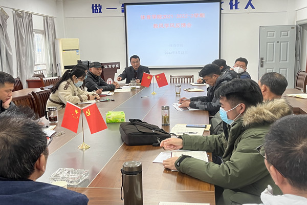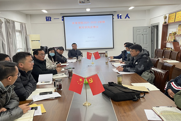 为进一步加强教风学风建设,弘扬优良校风,营造体育学院良好育人和成才环境,不断提升人才培养质量,3月23日下午,体育学院在学院会议室召开了教风学风反馈会。体育学院院长姚磊、学院党委书记芮德武、副院长赵胜国、学院教学督导、教研室主任、听课小组组长、全体辅导员、理论课课程教师参加了此次会议,会议由体育学院副院长赵胜国主持。