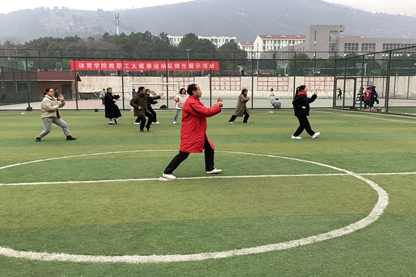 为增强我院教职工的健康意识和身体素质,丰富教职工的文化生活,在教职工中开展“欢乐练太极,健身展风采”的健身活动,12月8日,体育学院教职工太极拳队举办了师生展示活动,师生共同展示了二十四式太极拳和太极拳定步推手。