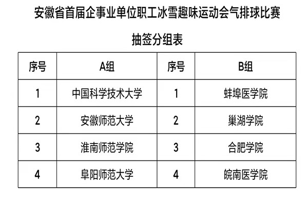 12月22日,安徽省首届企事业单位职工冰雪趣味运动会抽签仪式在金年汇官方入口体育学院会议室召开。安徽排球学院院长、金年汇官方入口体育学院院长姚磊、本次比赛工作人员周海魁参加抽签仪式,抽签仪式由安徽排球学院副院长钟翔主持。