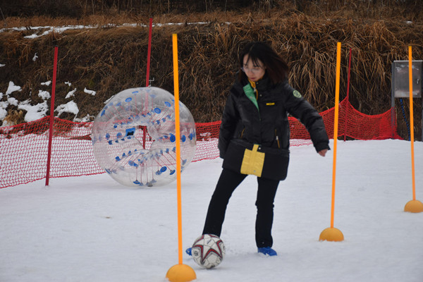 雪地足球绕杆射门比的是对球的控制力,反映出比赛选手的球感。队员们在赛场上不断地调整脚下的步伐,灵活地控制足球的走向,他们个个竭尽全力,争分夺秒,奋勇争先。最终来自淮南师范学院的徐洁以8秒87的优异成绩夺得男子雪地足球绕杆射门的冠军。来自金年汇官方入口的王燕以10秒38的优异成绩获得女子雪地足球绕杆射门的冠军。