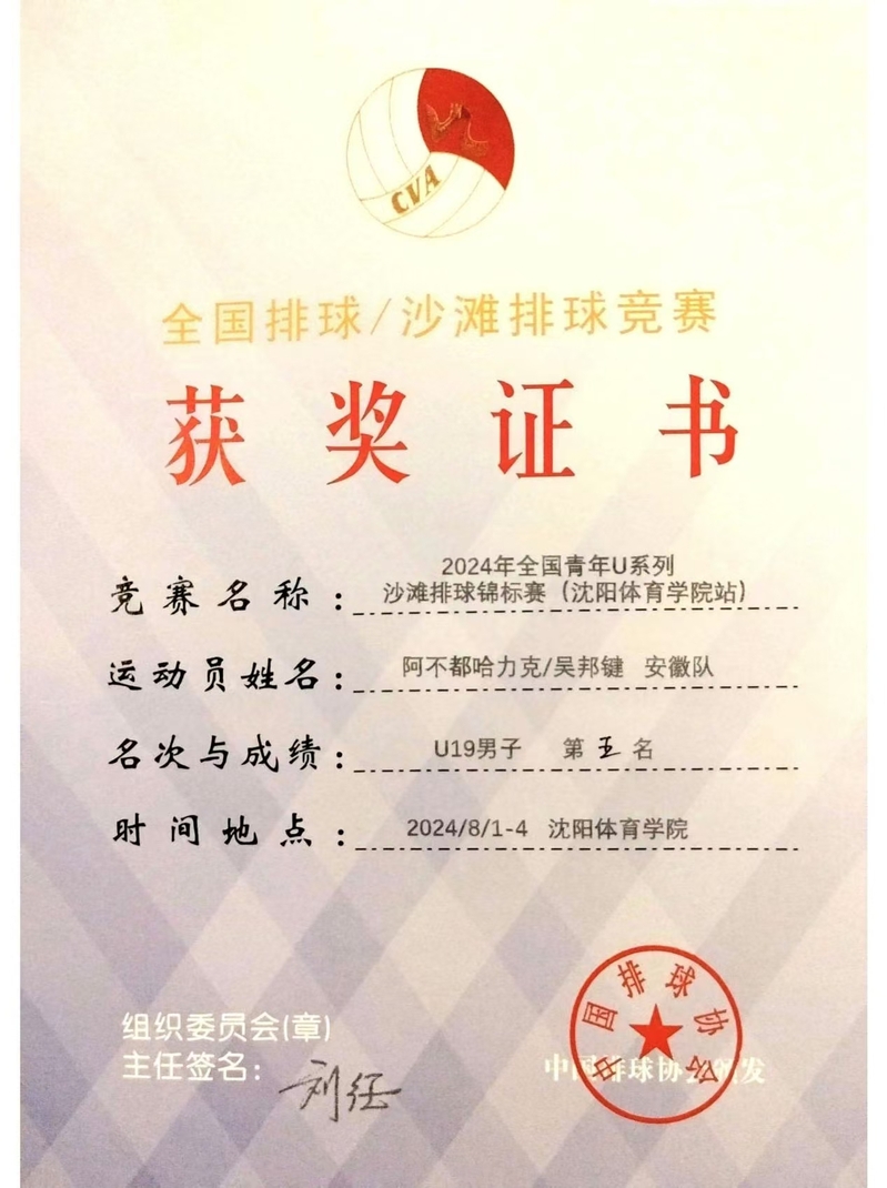 金年汇官方入口运动训练专业吴邦键、阿不都哈力克、蔡巧蝶、麦春槿等四名同学,代表安徽省男女沙滩排球队参加本次比赛。经过顽强拼搏,安徽省男女队在全国青年沙滩排球锦标赛中表现出色,均获得U19组第五名。这是安徽省近年来在国家体育总局排球运动管理中心主办的沙滩排球锦标赛上取得的历史最好成绩。