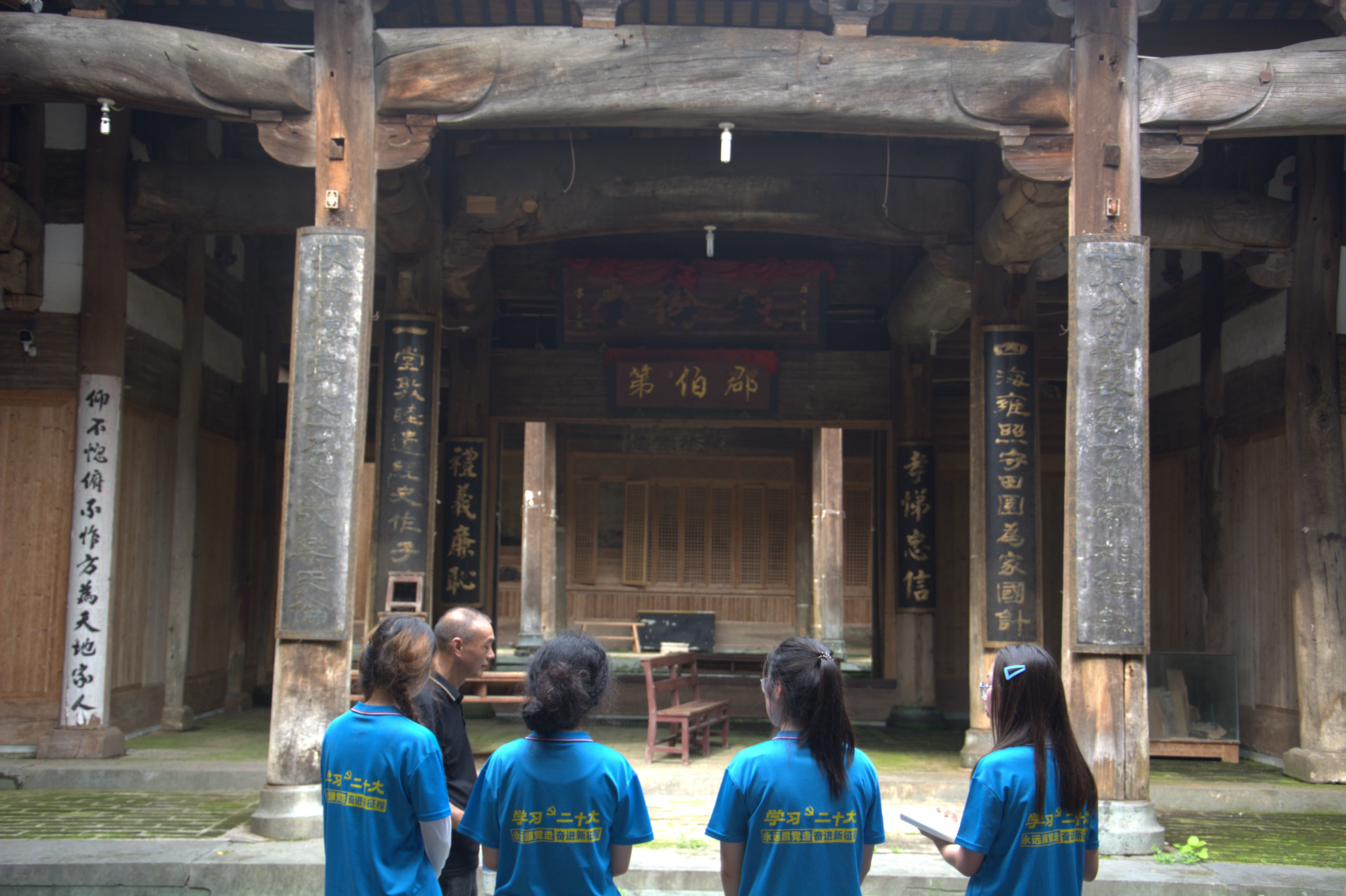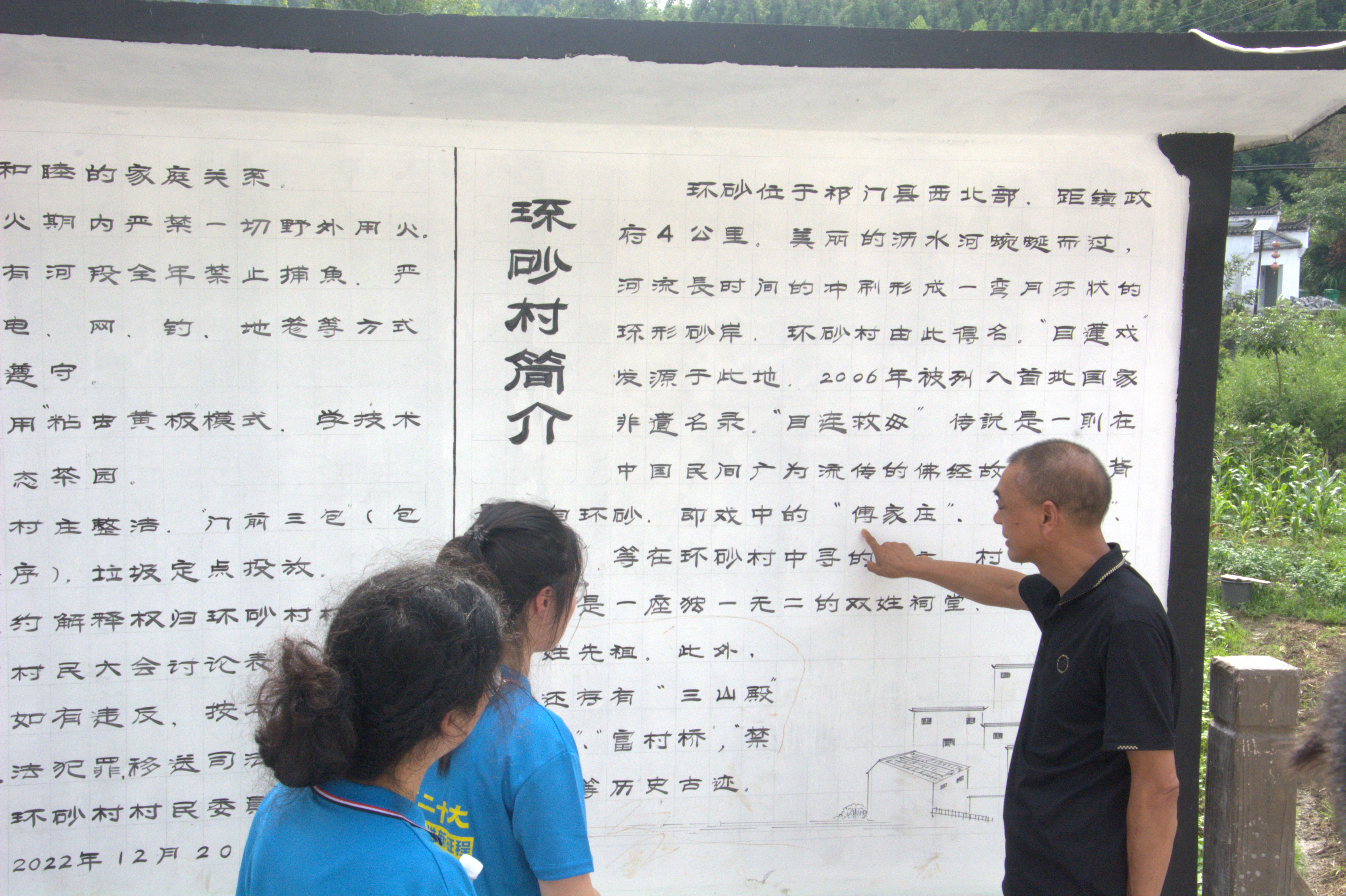 实践团随着方锦祁的脚步先后参观了叙伦堂、富村桥、八卦井等历史古迹。其中村中心的叙伦堂原是程、傅双姓祠堂,现为环砂村目连戏传习基地,已被列入省级文物保护单位。祠堂上用苍劲有力的笔法写着庄重大字“叙伦堂”和程氏祖训“孝悌忠信、礼义廉耻”。目前,环砂村计划将徽州砖雕与目连戏文化相结合,打造一座独具魅力的非遗文化桥,以亮点村的形式来促进非遗传承和乡村振兴。