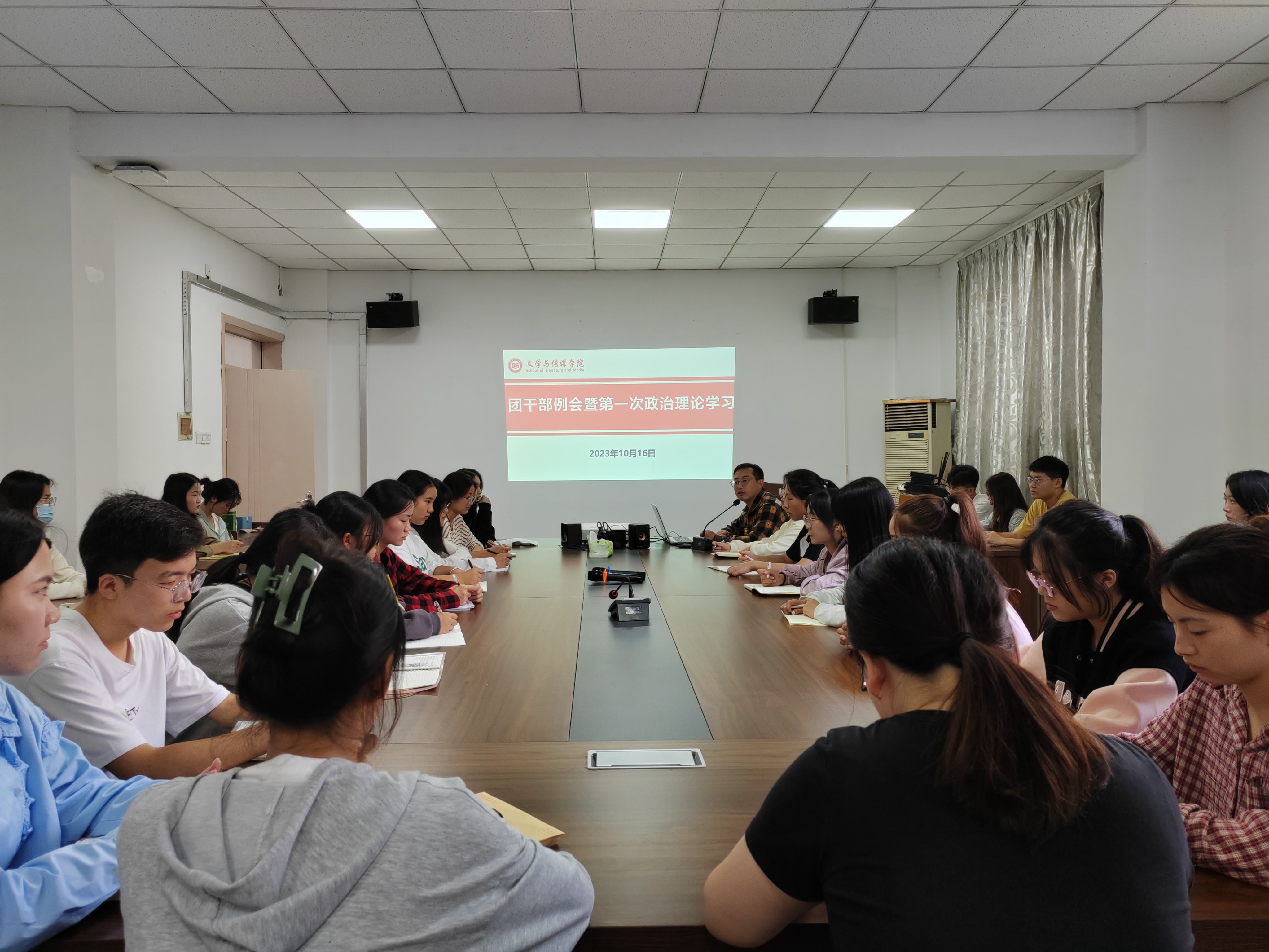 为做好新学期团支部各项工作,10月16日中午文传学院在敏行楼2楼大会议室召开新学期团干部会议,会议由院团委负责人程生风老师主持,各班团支部书记、院各学生组织和社团负责人参加了会议。