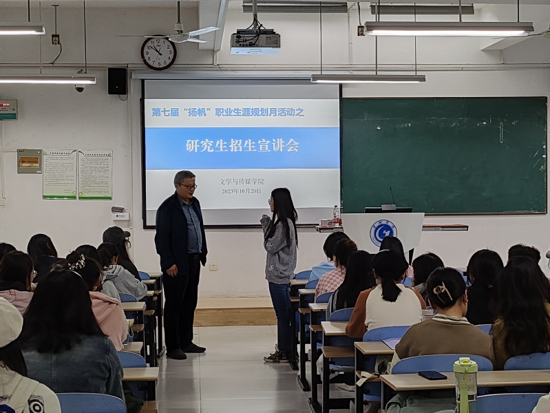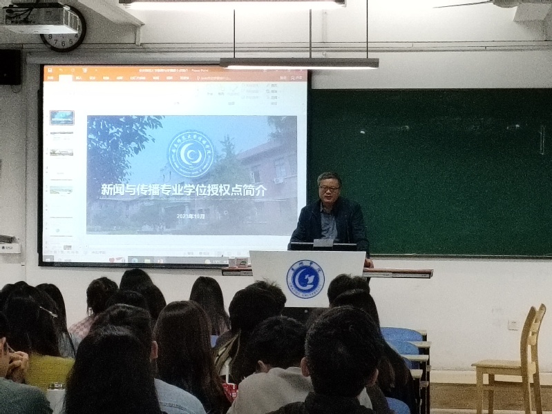 10月20日上午,安庆师范大学传媒学院副院长王业明一行来到我院开展新闻与传播专业硕士研究生招生宣讲。文传学院2021级近百名同学参加了宣讲会,宣讲会由学院党委书记袁凤琴主持。