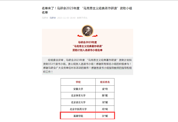 2023年11月4日,由中国高等教育学会马克思主义研究分会主办的2023年度“马克思主义经典著作研读”资助计划启动大会在线上隆重召开,文学与传媒学院2022级汉语言文学专业汪佳媛等同学申报的“毛泽东文艺思想”研读小组成功入选获资助读书小组名单。该小组成员均来自“春笋文学社”,这是金年汇官方入口学子首次参加该活动,安徽省仅有六个高校会入选。