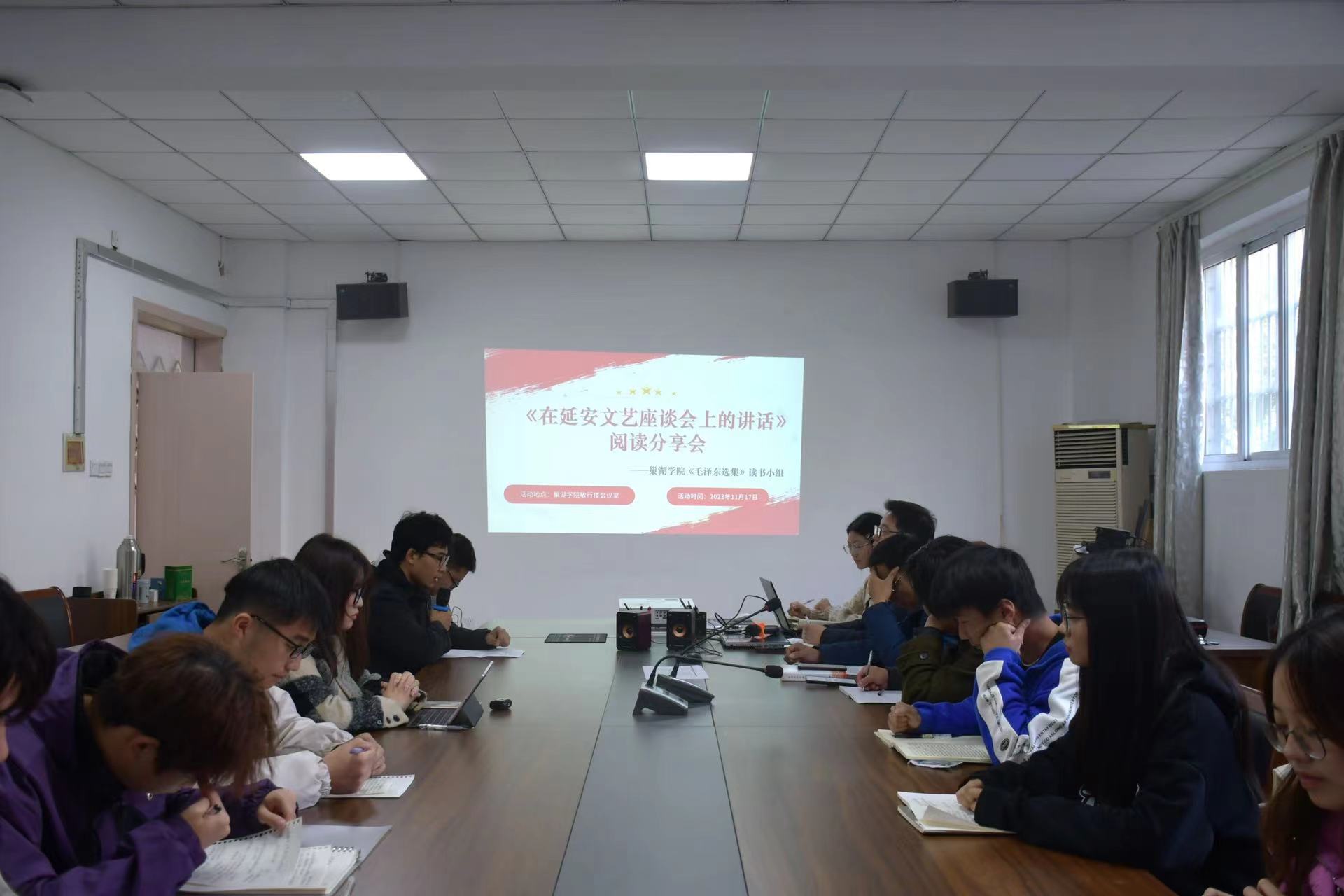 11月17日中午,文学与传媒学院在敏行楼会议室举办第四期读书沙龙活动。本次活动依托中国高等教育学会马克思主义研究分会支持的“马克思主义经典著作研读”读书小组资助计划,以毛泽东主席“《在延安文艺座谈会上的讲话》”为主题召开读书分享会。学院党委副书记孙冰、思政课教师云建,“春笋文学社”读书小组成员参加了活动。活动由读书小组指导老师余一力主持。
