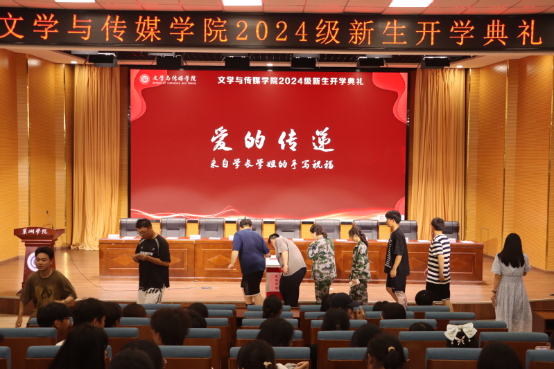 典礼开始前,活动设置了“抽盲盒”环节,新生们一一走上台抽取学院学长学姐们送给他们的祝福卡片。2024届毕业生毕业典礼上“爱留巢院”环节中毕业生送给学弟学妹的手写祝福,在2024级新生开学典礼上实现了“爱的传递”。