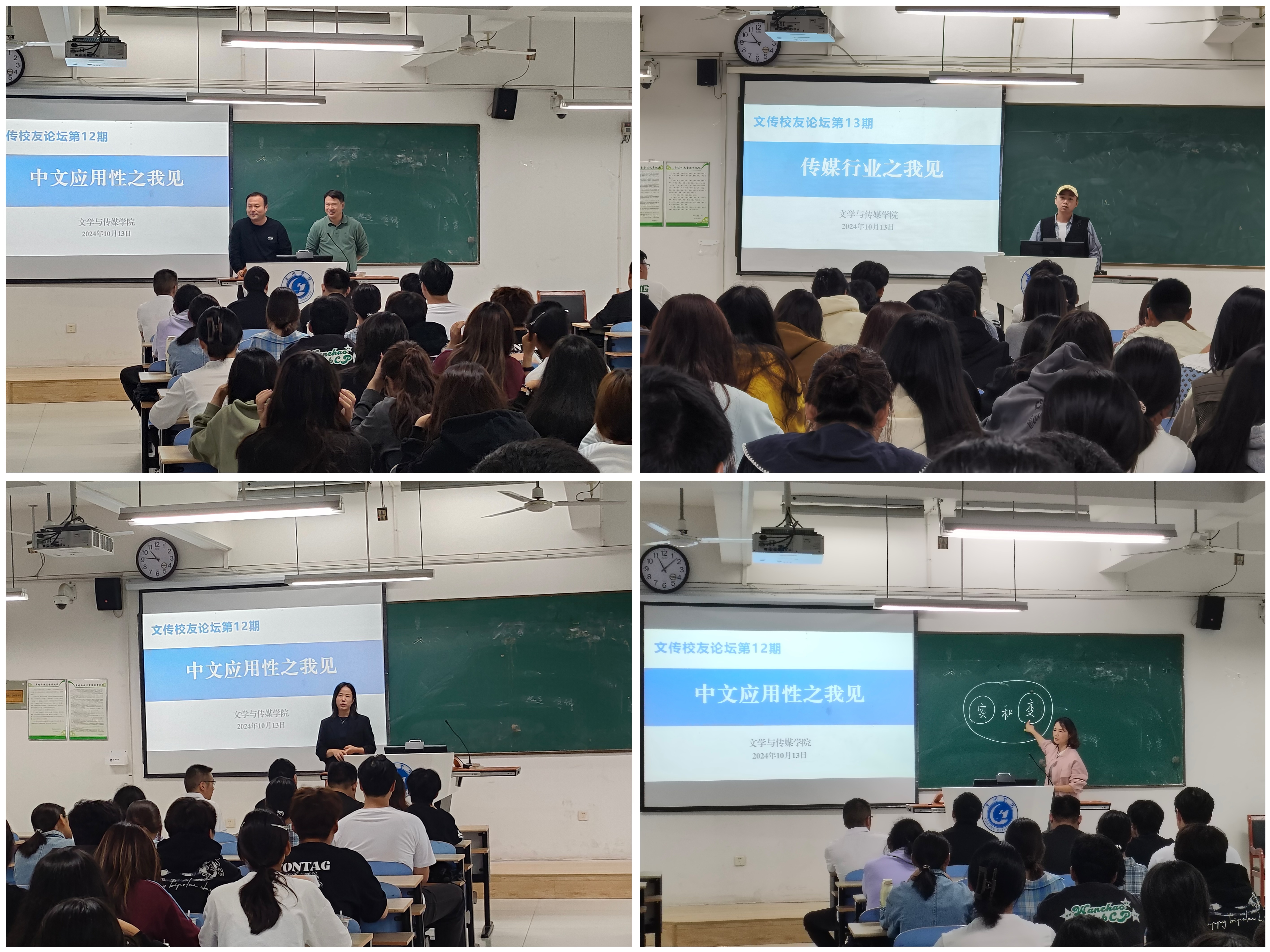 随后,9名校友们移步慎思楼,分别以“中文应用性之我见”和“传媒行业之我见”为题,面向大一新生开展第12期文传校友论坛和第13期文传校友论坛。他们结合自己的成长历程多方面诠释了中文和传媒的应用性,从多个角度分析了汉语言文学专业和广告学专业在职场上的发展前景和核心竞争力。同时,他们鼓励学弟学妹们在校期间要多读书,多思考,多实践,厚积薄发,不断提升自己的专业技能和综合素质,以适应不断变化的职场需求。