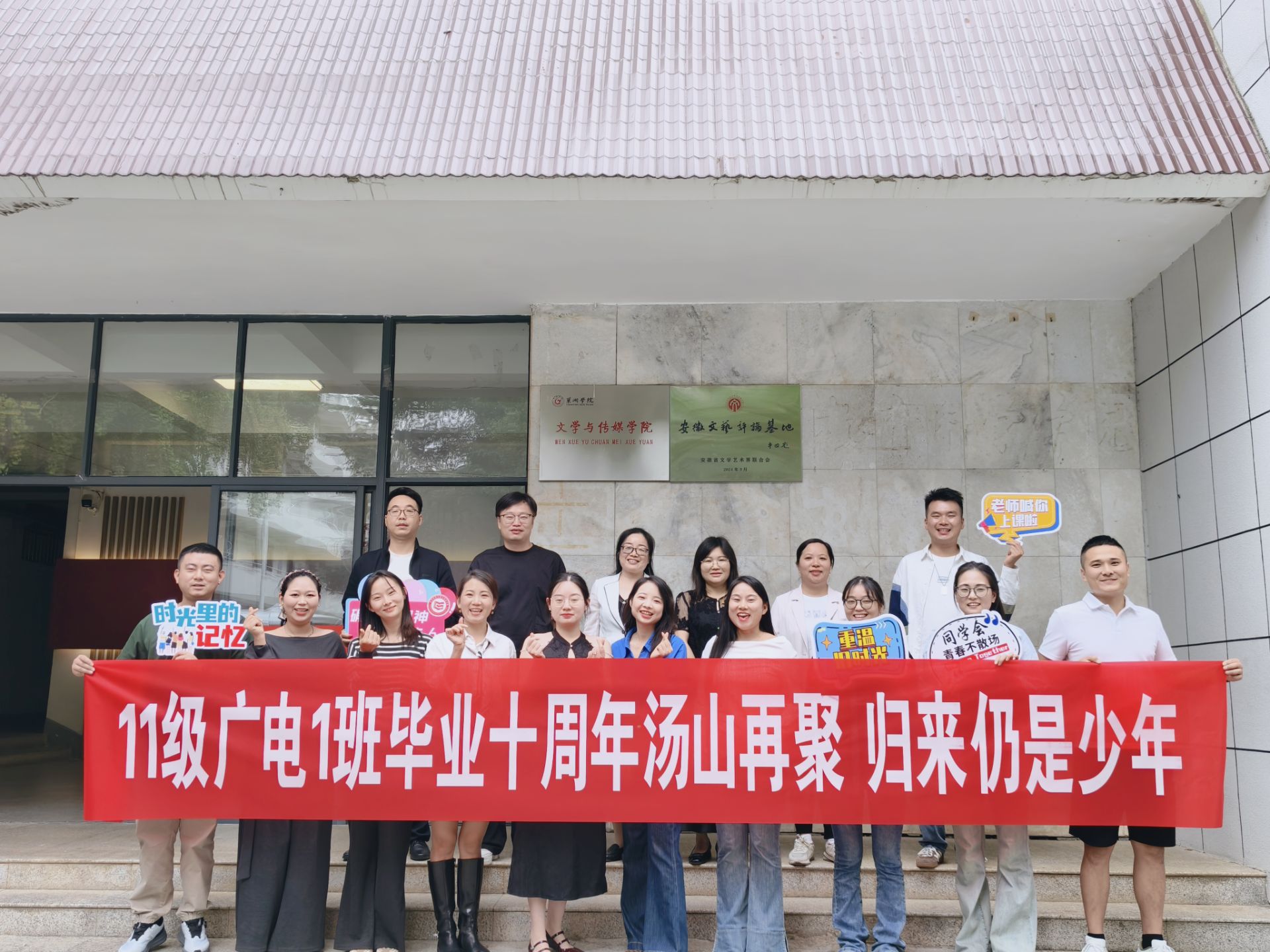 10 月 12 日,文学与传媒学院 2011 级广播与电视学专业1 班校友在毕业十周年之际,从全国各地重返母校、齐聚汤山校园共叙同窗情谊,学院党委书记袁凤琴、原班级辅导员李文娟等教师代表热情接待了返校校友。
