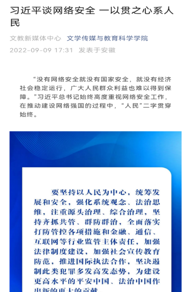 为深入学习贯彻习近平总书记关于网络强国的重要思想,营造安全、健康、文明、和谐的网络环境,2022年9月6日至11日,文传学院开展2022年网络安全宣传周系列活动。