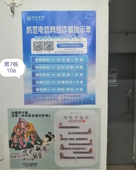 学院充分依托学院官方微信、易班·今日校园平台宣传网络安全相关知识,并以学生喜闻乐见的方式,制作有学院特色的网络安全宣传海报,发放到各班级宿舍,张贴在宿舍醒目位置,时刻提醒同学们防范网络电信诈骗。
