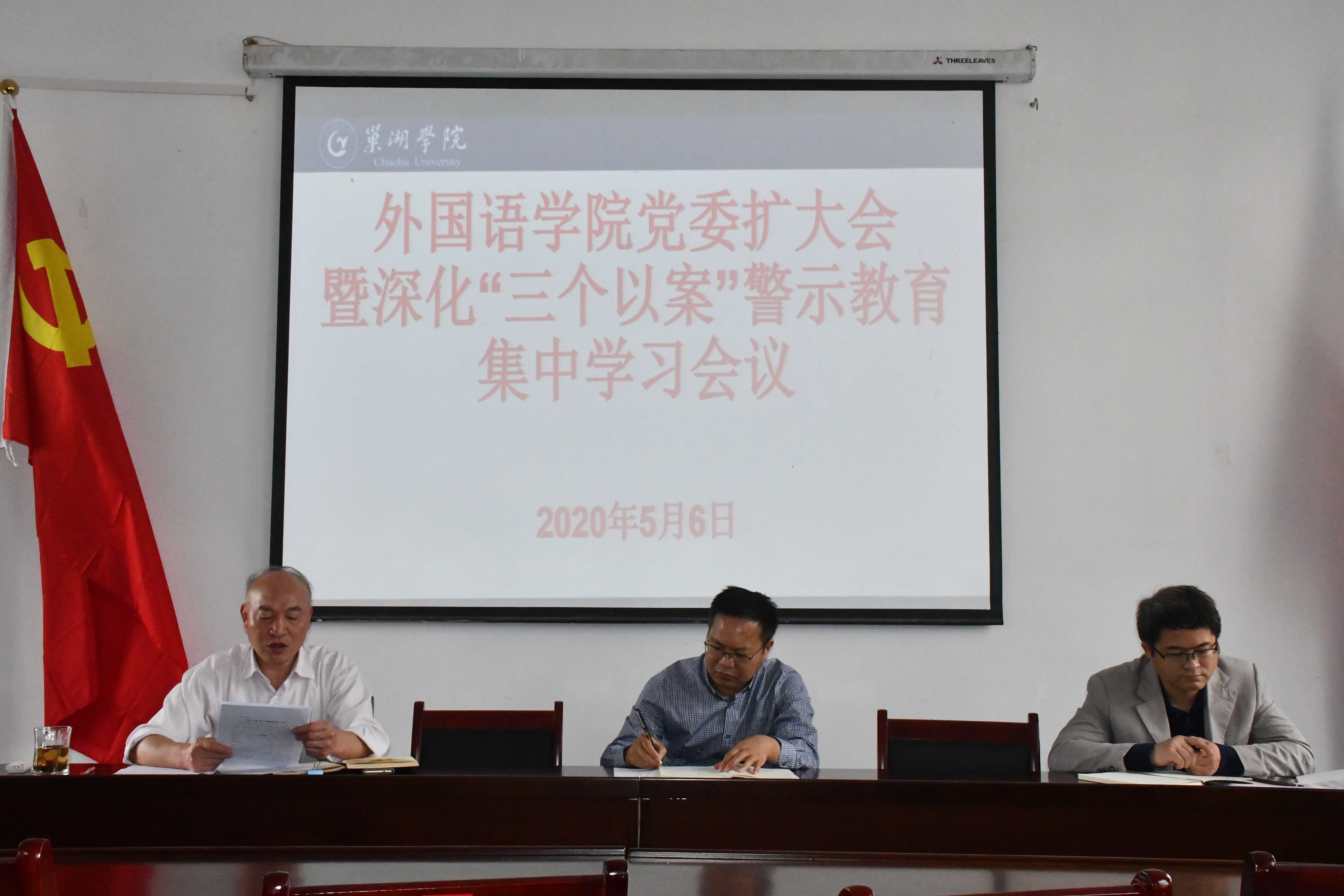 5月6日下午,外国语学院在明德楼四楼会议室召开党委扩大会暨深化“三个以案”警示教育集中学习会议。会议由学院党委书记单自华同志主持会议。学院党委成员及教工和学生党支部书记参加会议。