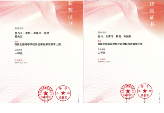 2020年12月18-20日,在高等教育出版社主办的首届全国高等学校外语课程思政教学比赛中,外国语学院再接再厉,获得大赛一等奖、二等奖各一项。为深入贯彻落实习近平总书记关于教育的重要论述和全国教育大会精神,也为响应教育部《高等学校课程思政建设指导纲要》的精神,高等教育出版社和《中国外语》编辑部举办了本次比赛,旨在进一步挖掘外语课程中蕴含的思政元素,大力推动以“课程思政”为目标的课堂教学改革,使外语课程与思想政治理论课同向同行,全面提升全国高校外语教师课程思政教学能力。