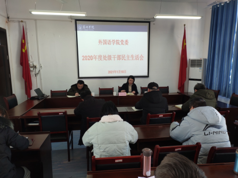 1月18日下午,外国语学院在明德楼四楼会议室召开2020年度处级领导干部民主生活会。副校长朱定秀、科技处副处长朱明、科技处秘书高华敏一行到会指导。外国语学院党政领导班子成员参加会议,学院党委委员、科级干部、党支部书记、教研室主任列席会议。会议由学院党委书记单自华主持。