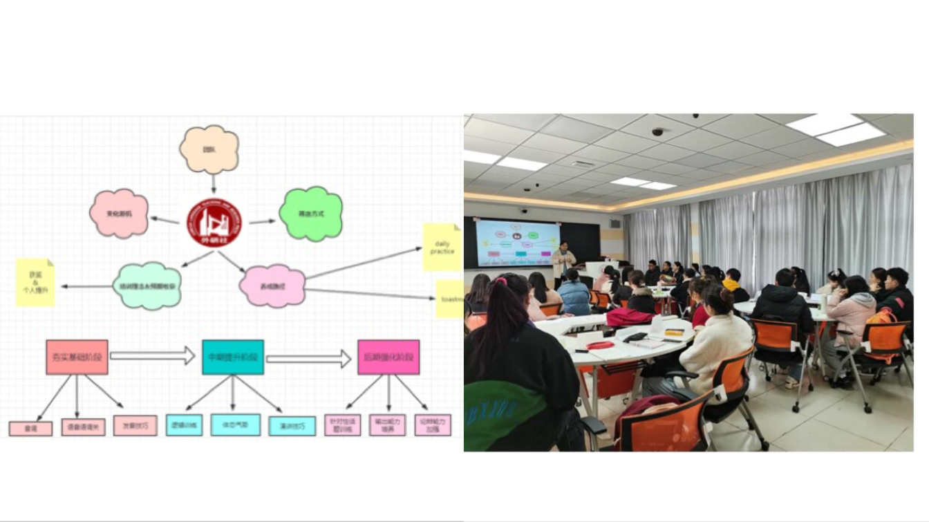 来自英语专业和非英语专业的30多位学生和全体指导教师团队参加了仪式。这些学生都是英语演讲的痴迷者、爱好者,对英语学习热情饱满。指导教师们对演讲大赛指导规划、英语学习方法、口语提升技巧、演讲比赛技巧一一作了经验分享。 项目负责人董艳老师首先对外研社杯英语演讲大赛从团队、变化新机、培训理念、预期收获、选手成长与选拔淘汰机制等方面进行了全方位的介绍,并详细规划了选手的进阶之路。董老师强调了外国语学院对于英语演讲比赛的重视,鼓励大家主动积极参与,在备战演讲比赛这个“场域”中磨砺提升自己的英语能力,同时,对学生也提出日常练习的具体要求。在董老师提议以及指导教师团队与学生协商后,决定成立启动英语演讲俱乐部,俱乐部学生成员每周进行一次演讲展示、观摩演讲或比赛视频与讨论,并由指导教师轮值主持指导。