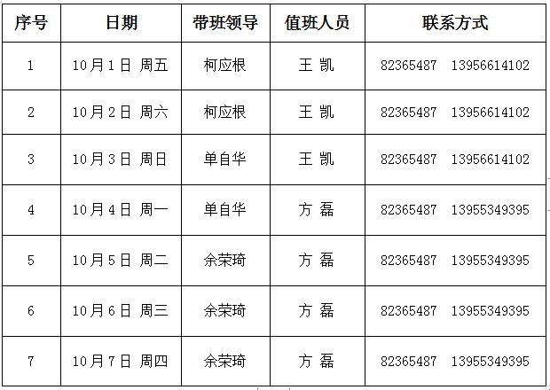 备注: 1.值班时间:8:00至22:00;值班地点:值班人员各自办公室。