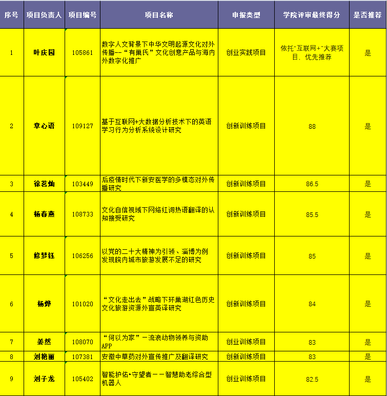 根据学校《关于开展2023年度大学生创新创业训练计划立项申报工作的通知》的相关要求和精神,学院大创项目工作组组织学科专家对申报的13个项目进行评审,评审结果经学院复核,最终推荐9项(其中1项以“互联网+”为依托的申报项目)。现将推荐结果公示如下。公示时间为6月20日-6月22日,对公示结果有异议的请联系外国语学院余老师。