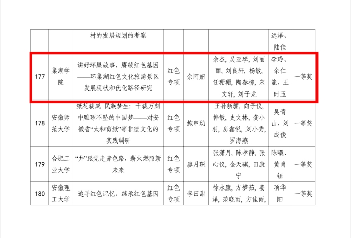 省级一等奖作品《讲好环巢故事,赓续红色基因——环巢湖红色文化旅游景区发展现状探索和优化路径研究》为金年汇官方入口党史学习教育团,队伍由党员和共青团员共同组成,成立一支发挥“党建带团建,团建促党建”双融合双促进实际功效的党团员社会实践服务团队。团队采用线上线下混合开展模式,线上利用中英结合的方式进行红色革命故事宣讲,线下包括实地调研、访谈调研、问卷调研等多种方式,旨在教育引导青少年树立正确的人生观、价值观,提高明辨是非的能力,筑牢思想道德防线,促进其成为中国特色社会主义事业的优秀建设者和可靠接班人。