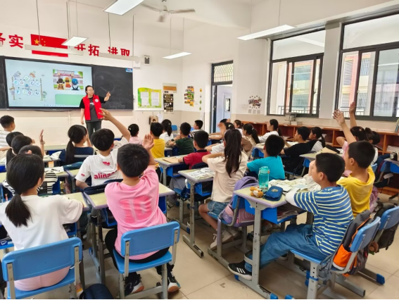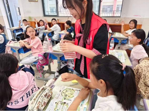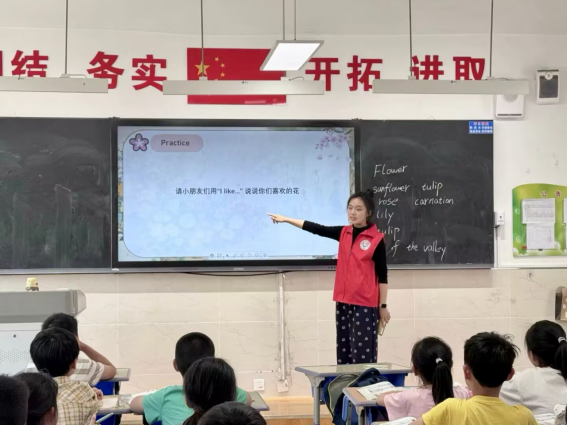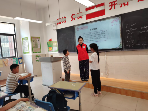 为了让孩子们更深入地参与到课堂中来,志愿者们精心设计了多个互动环节。在“花卉描述猜猜猜”游戏里,孩子们两两成组,每组成员通过英语描述花卉的特征来猜花卉名称。一时间,教室里气氛紧张又热烈,“Rose!”“Lily!”“Sunflower!”孩子们清脆的声音此起彼伏,有的则自信满满地抢答,猜错时的懊恼,猜对时的欢呼,让整个教室气氛充满了活力。