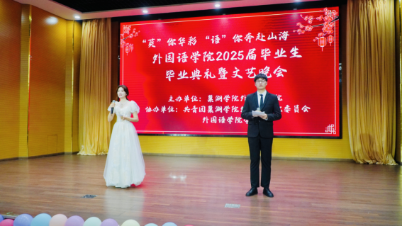 为营造温暖和谐的毕业季氛围,加强学院校园文化建设,传递母校和学院对毕业生诚挚的祝愿,让毕业生们重温大学四年的美好青春回忆,5月19日19:00,外国语学院在求实楼报告厅举行2025届毕业生毕业典礼暨文艺晚会。外国语学院党政班子成员、教师代表、毕业生家长代表、辅导员和2025届毕业生参加。