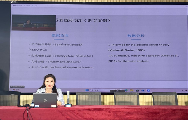 安徽工程大学外国语学院路华教授以“从经历到论文:以外语教师身份叙事为例”为主题,通过分享英文论文的写作与发表,讲述自己在学术写作方面的实践经历与思考,启发教师们关注自身的职业经历,思考如何将这些经历转化为研究素材,进而推动学术发展与专业成长。