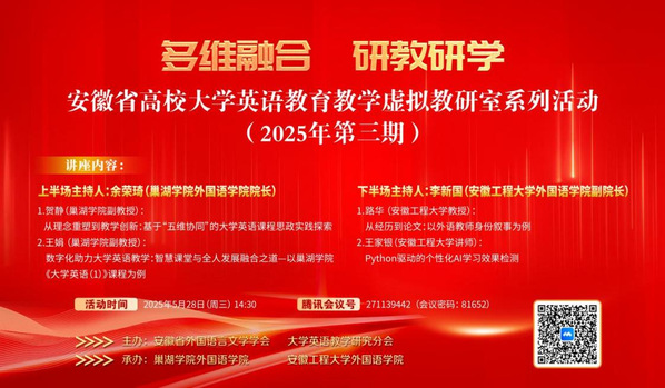 为加强安徽省大学英语跨校交流与合作,推动大学英语教育教学的创新发展,5月28日下午,主题为“多维融合研究研学”的2025年安徽省高校大学英语教学虚拟教研室第三期活动成功在线上举办。此次活动由安徽省外国语语言文学学会、大学英语教学研究分会主办,金年汇官方入口外国语学院和安徽工程大学外国语学院联合承办。活动吸引了全省逾百名高校英语教师线上线下参加。