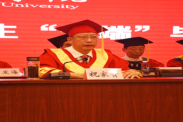校长祝家贵教授发表题为“星辰大海 后会有期”的毕业典礼演讲。他带领大家回顾了大学四年的美好生活,介绍了四年里学校发生的变化,对圆满完成学业、走向人生新征程的全体毕业生表示祝贺。史无前例的疫情使2020届毕业生成为学校最特别的一届毕业生。虽然没有扶正流苏、颁发证书、握手道别、合影留念,但相聚“云端”,心在一起。祝家贵寄语2020届全体毕业生要坚守信念、加强学习、懂得自律。以更高的视野、更广阔的胸怀、更持久的坚守将个人追求融入国家发展、民族进步之中;要不断创新,不断学习,做母校最好的“名片”。你们在哪里,学校的边界就在哪里;得意时要经得住浮华,失意时要耐得住寂寞,多陪陪家人,多关注身心健康,探寻内心追求的真实幸福。疫情过后,欢迎大家常回母校看看,祝愿2020届全体毕业生前程似锦!生活幸福!