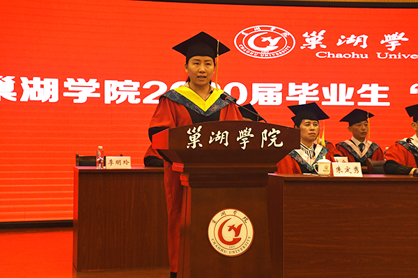 教师代表化学与材料工程学院院长李明玲教授表达了全体教师对毕业生的深深祝福。希望2020届毕业生该坚持时就坚持,以“不变应万变”;该改变时就改变,以“万变应不变”,不断突破自我,用硬核实力回应所谓的“最难毕业季”,做永远的最美巢院人。