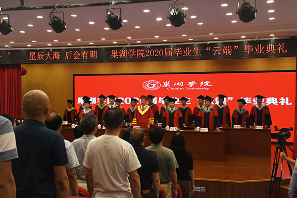 毕业典礼在全体人员高声合唱雄壮激昂的国歌声中拉开序幕。