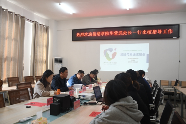 在淮南师范学院,学生处处长杨绪武接待了学校一行,并着重介绍了学校智慧思政平台建设的经验做法。学生处副处长程业红从建设情况、建设目标、建设思路、网络平台建设和工作内容等方面介绍了该校学生社区一站式服务平台建设取得的实效。易班发展中心主任贾成光从主题活动开展、文创产品设计、学生骨干队伍建设等方面介绍了学校易班建设的基本情况。