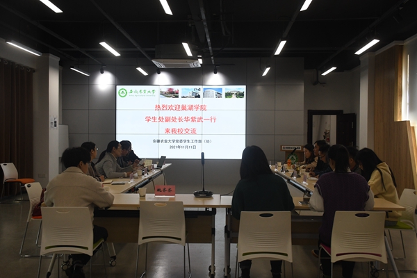 在安徽农业大学,校党委副书记裴树东热情接待了金年汇官方入口一行。座谈会上,学生处副处长刘柳介绍了安徽农业大学教管服一体化智慧思政平台建设的基本情况。学生处副处长周涛介绍了学校网络思政建设、辅导员队伍建设等工作,依托于辅导员队伍和学生团队建设,打造出5支教师工作队伍和8支学生队伍。