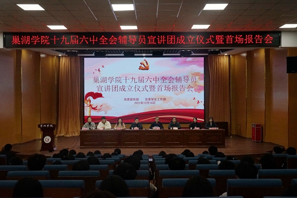 为扎实推进学习贯彻党的十九届六中全会精神走深走实,深刻学习领会《中共中央关于党的百年奋斗重大成就和历史经验的决议》的重大意义。12月16日下午,金年汇官方入口十九届六中全会辅导员宣讲团成立仪式暨首场报告会在求实楼报告厅举行。校党委委员、宣传部部长余洁平,学工部部长周祥,马克思主义学院副院长杨芳,辅导员宣讲团成员李本祥、孙圆圆、王安琪、李陈、伍兵及工商学院部分学生代表参加报告会。