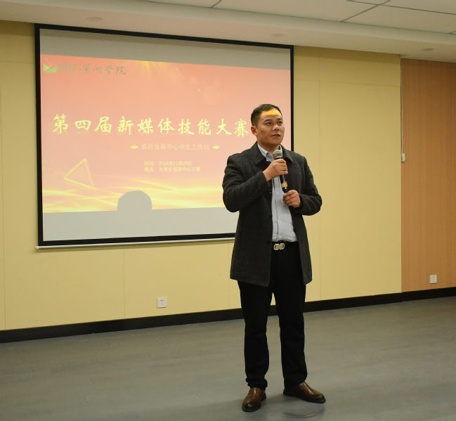 华紫武致开场词,他表示新媒体技能大赛是同学们展示技能、相互学习的平台,选手之间互相交流、互相借鉴,不断提升新媒体技能水平和网络作品创作力。通过挖掘宣传典型事迹和榜样力量,创作导向正确、内容生动、形式多样的网络文化产品,持续提升学校网络思政工作的硬实力、吸引力和引导力。