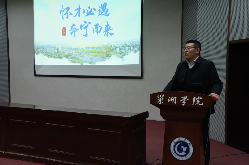 1月13日下午,学校在致知楼报告厅开展实习就业宣讲活动。华紫武代表学校向怀宁县委一行来校招才引智表示热烈欢迎,对怀宁县人社局安排接送怀宁籍学生返乡的贴心服务表示感谢。他介绍了学校基本办学情况、人才培养目标以及怀宁籍学生数据,对学校就业工作进行基本介绍。华紫武表示,学校会全力配合好这次活动的组织开展,让学生返家之路变成省心之路、放心之路、暖心之路。祝鹤鸣对学校的精心接待表示感谢,他从四个维度向在场同学介绍了底蕴深厚的怀宁、蓬勃发展的怀宁、通达秀美的怀宁、求贤若渴的怀宁,希望同学们能抱着“怀才必遇 奔宁而来”的想法到怀宁施展才干,怀宁也会满满的诚意真心爱才、悉心育才、倾心引才、精心用才。与会同学集中观看了怀宁县宣传片,安庆英科医疗有限公司代表从企业规模、人才需求、薪酬体系等方面作了企业宣讲,学校在怀就业毕业生代表王玲进行了交流发言。