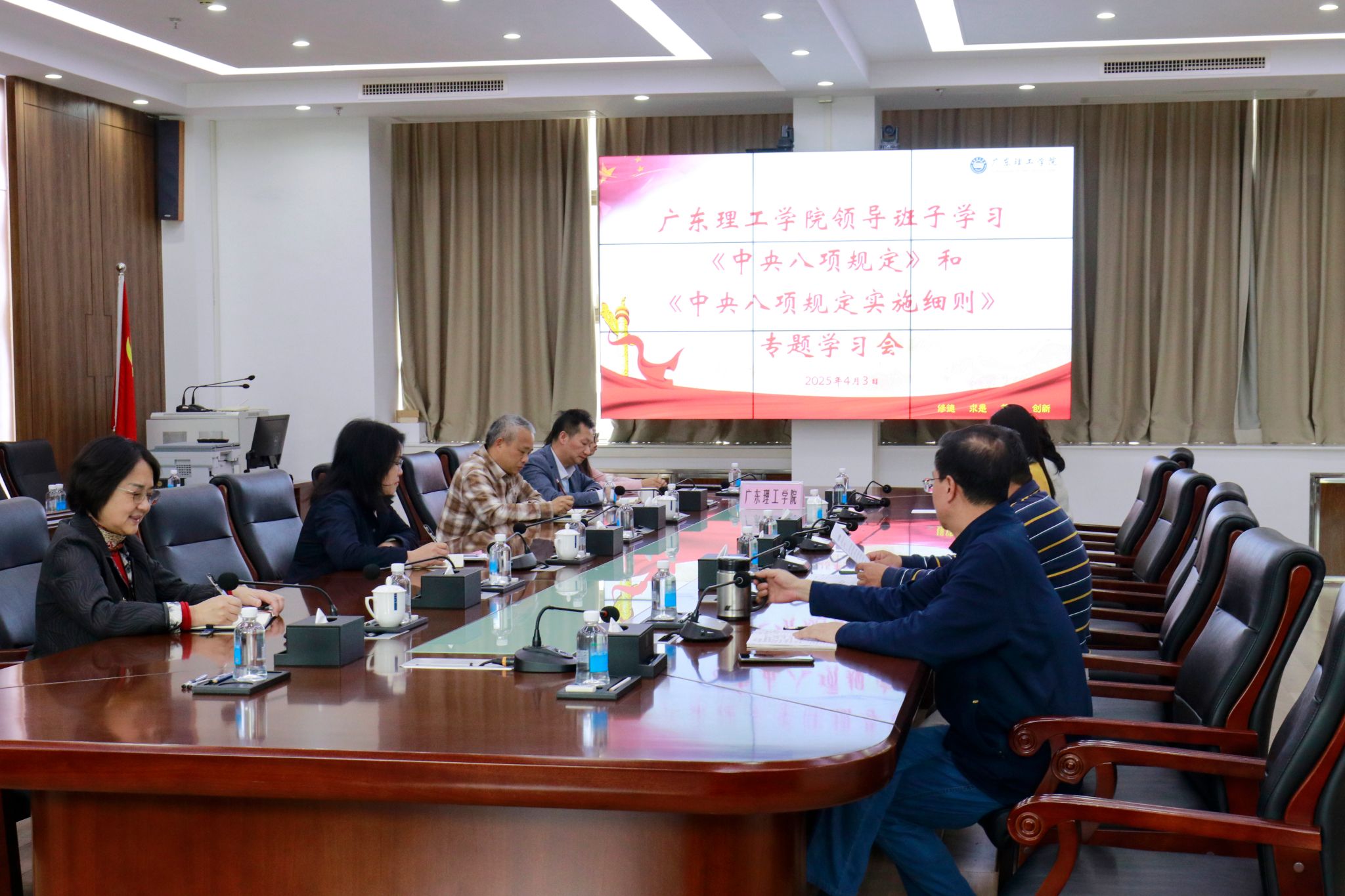 本网讯(宣传部)为深入贯彻落实党中央关于全面从严治党的要求,加强学校领导班子的纪律作风建设,4月3日,学校在综合楼 12 楼会议室召开专题学习会,集中学习《中央八项规定》和《中央八项规定实施细则》。全体校领导参会。会议通过领学解读、案例剖析、交流研讨等形式,重点围绕改进调查研究、精简会议活动、厉行勤俭节约等核心条款展开深入学习。领导班子成员结合分管工作,就如何构建作风建设长效机制展开讨论。会议强调,...