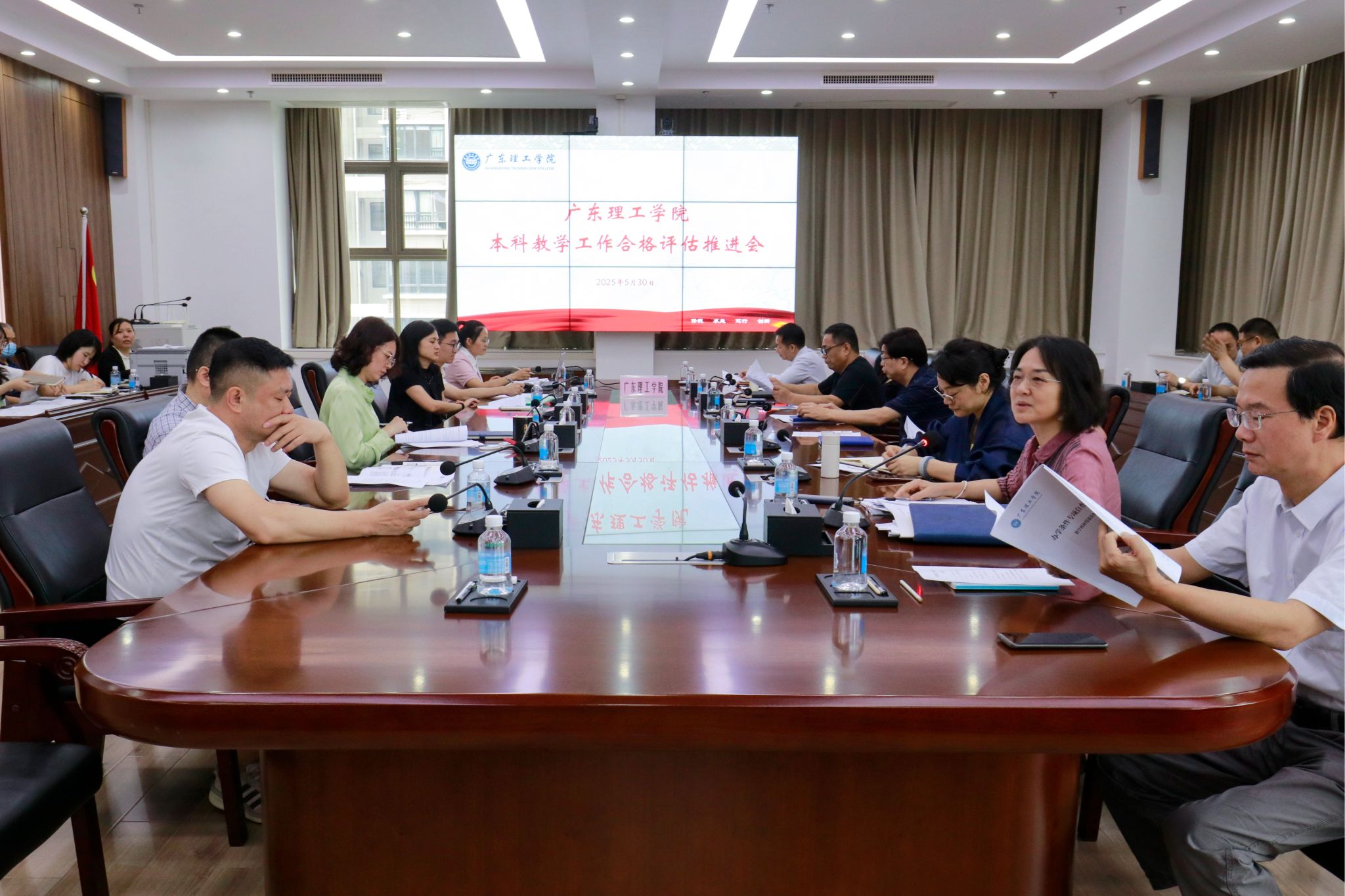 本网讯(教学质量监测与评估中心)5月30日上午,学校在高要校区综合楼12楼会议室召开本学期第5次本科教学工作合格评估迎评推进会。中国科培教育集团李艳总裁、全体校领导、党群及行政管理服务部门主要负责人、各教辅单位主要负责人、各教学单位党政领导班子、教学质量监测与评估中心全体成员参加会议,会议由学校常务副校长柴维斯主持。柴维斯首先通报了截至5月29日学校的教学日常运行支出财务入账情况及各部门、单位的完成情况...