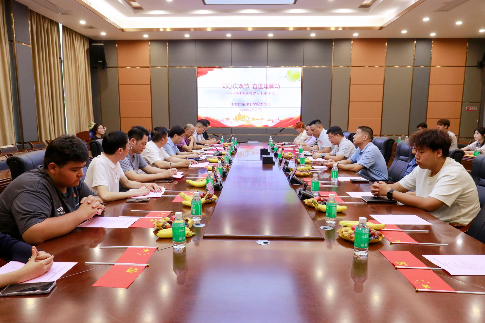 本网讯(组织部)金秋送爽,丹桂飘香。在中秋、国庆双节来临之际,为凝聚统一战线智慧力量,共话学校发展蓝图,9 月 28 日,学校党委于行政楼会议室召开”同心庆双节 奋进建新功“中秋国庆座谈会。校党委书记胡海建出席会议并讲话,党委组织部(统战部)部长黎伯毅主持会议。党委学生工作部部长谢桂袖,教务处处长张俊林、人事处处长黄志华等相关部门负责人,以及侨联主任赵宇宏、民盟主任曾亮及民主党派代表和学生代表共同参会...